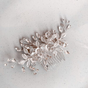 Florence Bridal Hair Comb is stunning with it’s pretty arrangement of silver flower leaves with adjustable crystal rhinestone vine create this luxurious wedding piece.Can be worn off to the side, tucked into an up-do or down-do.
